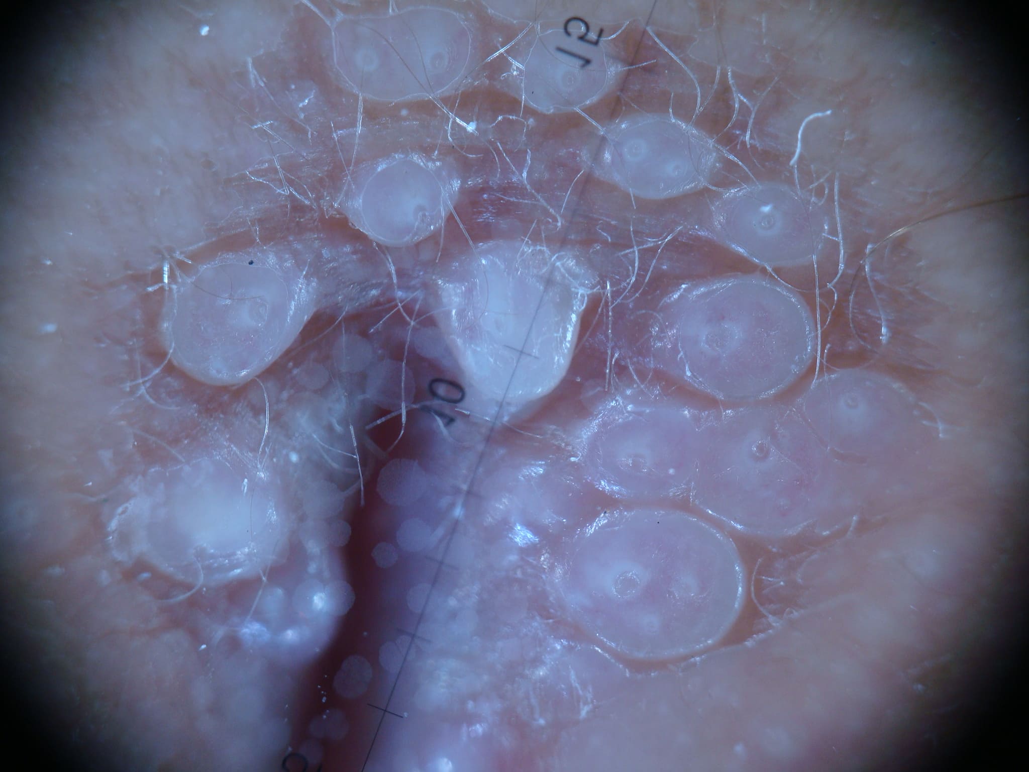 A la dermatoscopia se observó múltiples pápulas milimétricas perladas que confluyen a manera de racimos sin estructura vascular (Figura 2a y 2b). Con algo de dificultad se puede observar la presencia del poro central en cada molusco, que es una de sus características.